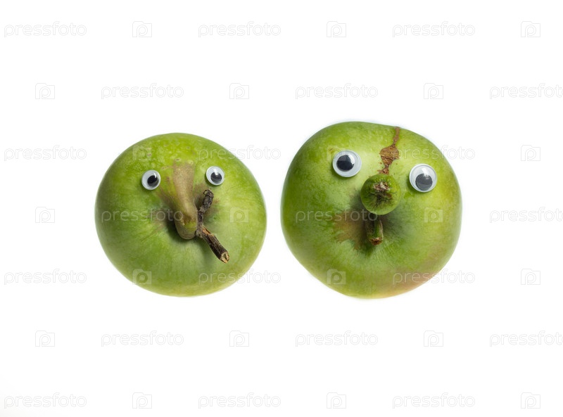 Модная уродливая концепция еды. Два зеленых забавных яблока с глазами на белом фоне. Плод необычной формы. Проблема пищевых отходов