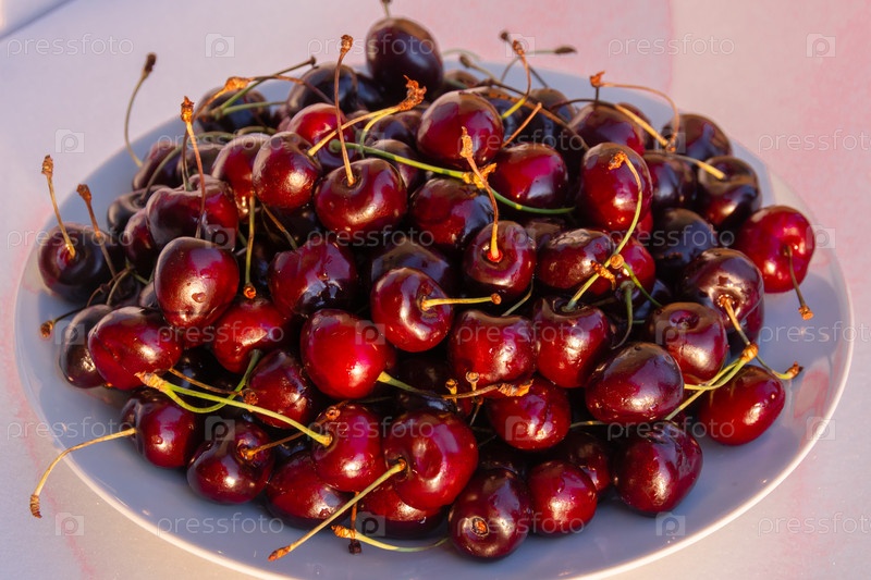 На садовом участке созрели крупные спелые ягоды сортовой вишни