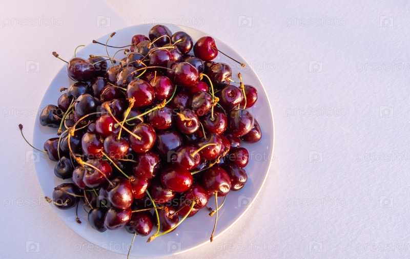 На садовом участке созрели крупные спелые ягоды сортовой вишни