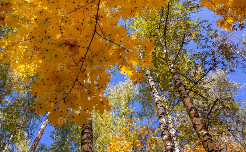 Красивые осенние деревья с желтыми листьями, освещенные солнцем