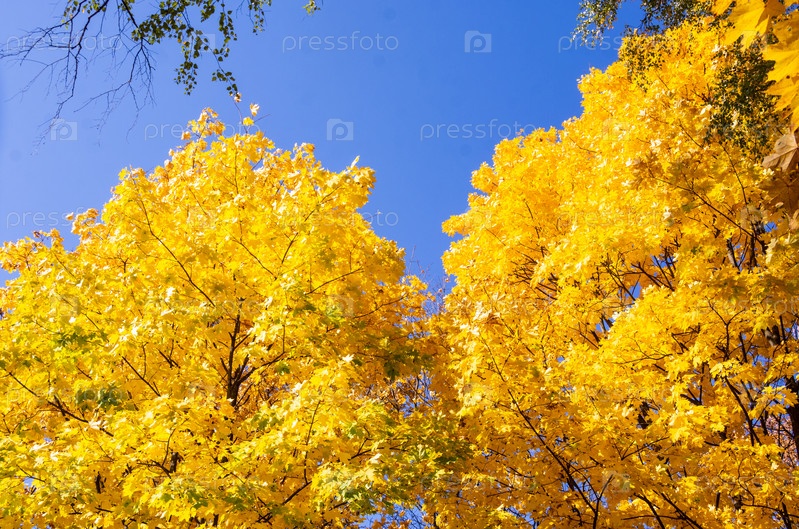 Красивые осенние деревья с желтыми листьями, освещенные солнцем