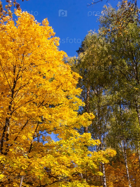 Красивые осенние деревья с желтыми листьями, освещенные солнцем