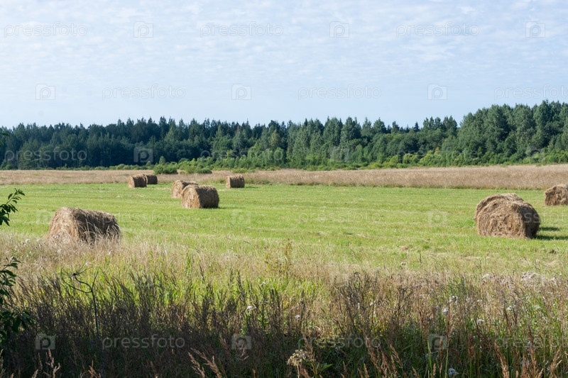 Сельский пейзаж. Сенокосы на поле. Рустический ландшафт. Куски сена на поле