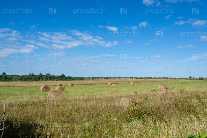 Сельский пейзаж. Сенокосы на поле. Рустический ландшафт. Куски сена на поле