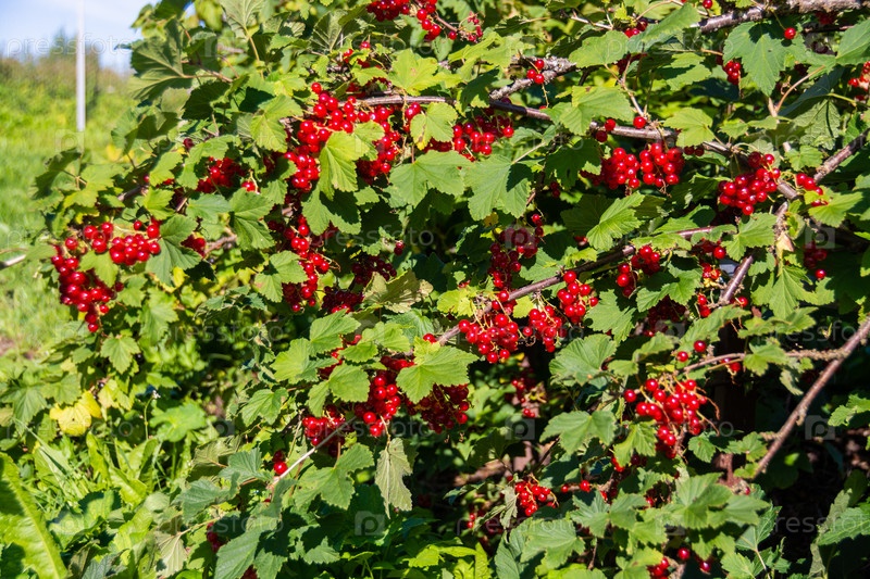 На садовом участке созрели крупные спелые ягоды красной смородины. Крупные спелые ягоды красной смородины созрели на садовом участке