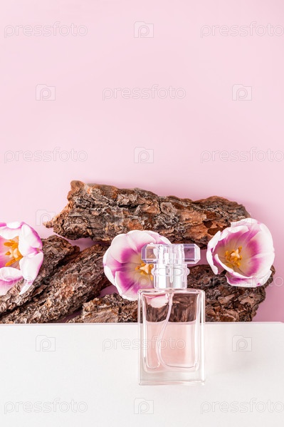 Бутылка косметического спрея или туалетной воды лежит на белом подиуме и части коры дерева с фиолетовыми цветами. вид сверху. вертикальный вид