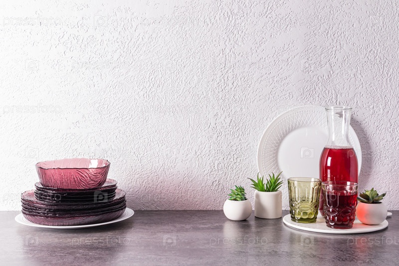 Набор современной стеклянной бордовой посуды и кувшин с виноградным соком на каменной столешнице в интерьере кухни. кухня фон