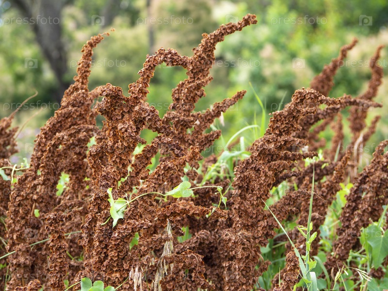 Коричневые семена лошадиного кобыла (лат. Rumex confertus) на фоне зеленой травы в лугу при естественном освещении Часть куста кобылы, растущего в природе с сухими семьями на стебле