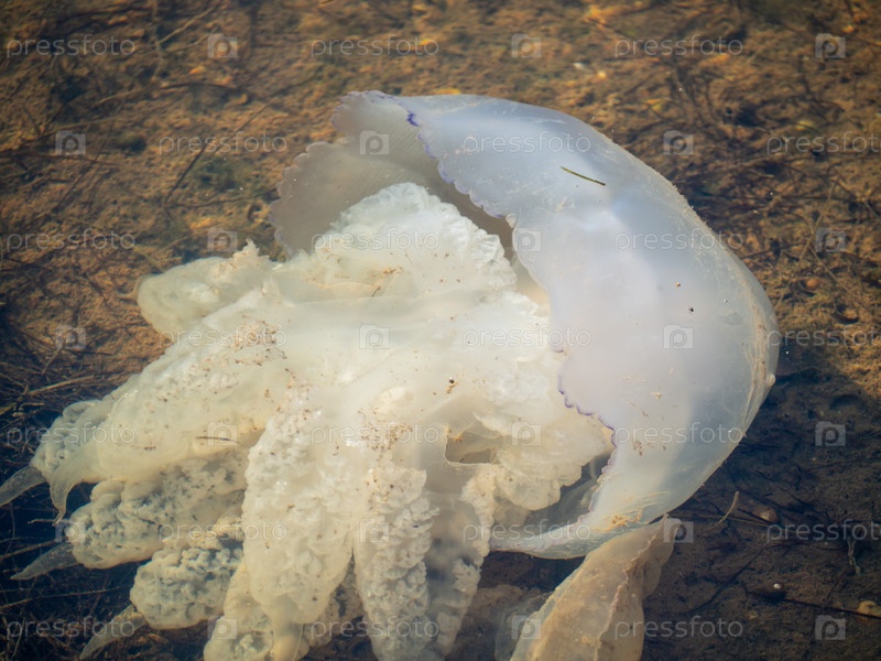 Крупный план медузы в воде на дне лагуны. Мертвая медуза, экологические проблемы