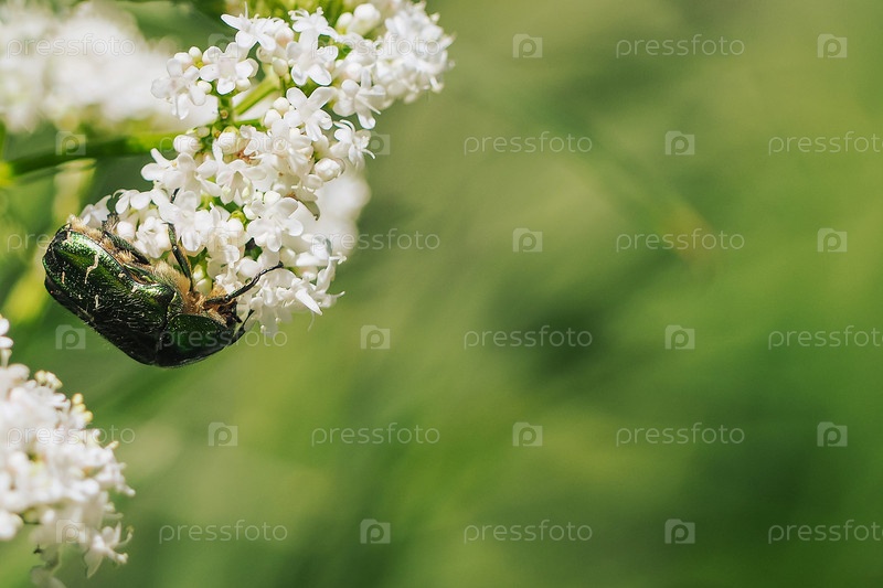 Крупный план зеленого жука на маленьких белых цветках. Крупный зеленый жук с бронзовым блеском на белых цветках посреди зелени крупным планом. Жизнь насекомых в дикой природе