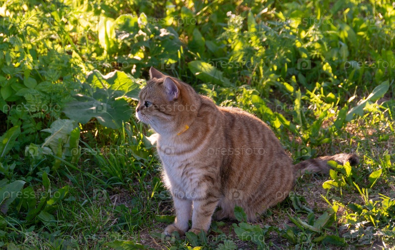 Красивая домашняя кошка гуляет по улице в теплое время года
