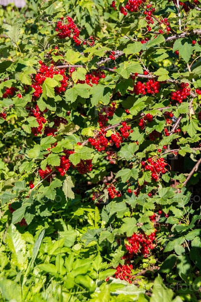 На садовом участке созрели крупные спелые ягоды красной смородины. Крупные спелые ягоды красной смородины созрели на садовом участке