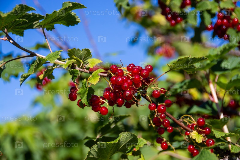 На садовом участке созрели крупные спелые ягоды красной смородины. Крупные спелые ягоды красной смородины созрели на садовом участке
