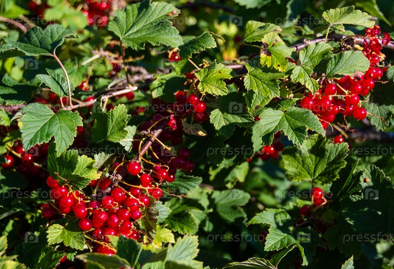 На садовом участке созрели крупные спелые ягоды красной смородины. Крупные спелые ягоды красной смородины созрели на садовом участке