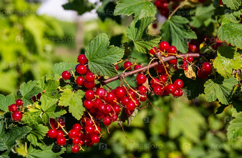 На садовом участке созрели крупные спелые ягоды красной смородины. Крупные спелые ягоды красной смородины созрели на садовом участке
