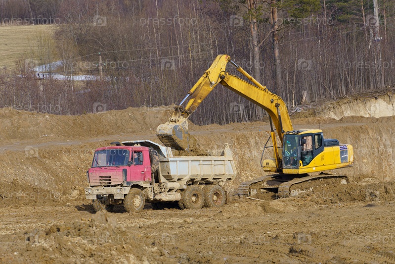Экскаватор загружает самосвал в песочницу