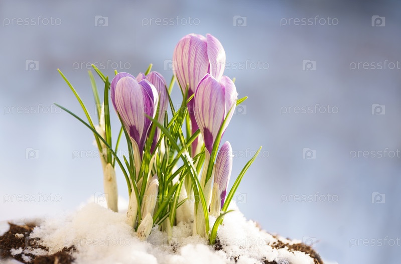 Первые весенние цветы. Сцена природы с цветущим фиолетовым цветком крокуса, покрытым снегом, макро