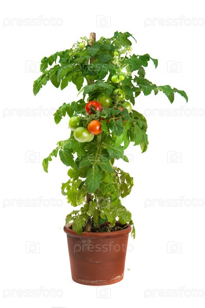Томатное растение, растущее в цветочном горшке, изолированном на белом