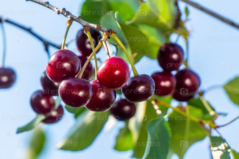 Красные ягоды черешни на ветке дерева