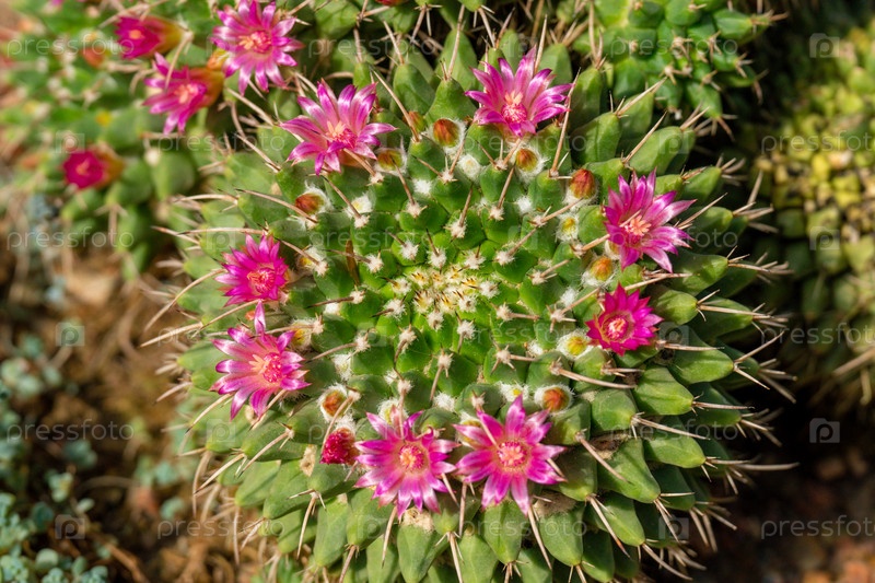Вид сверху на зеленый кактус с острыми иглами и розово-фиолетовым цветком