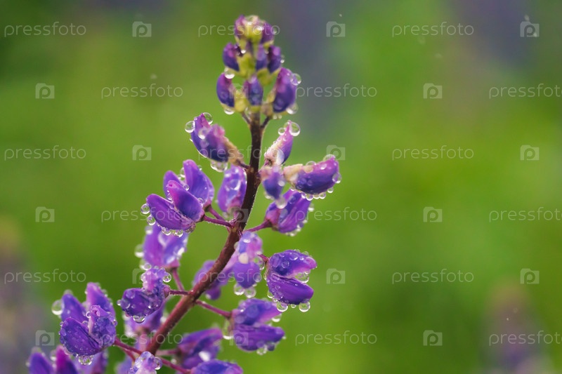 Красиво распустившиеся цветы люпина и капли дождя. Полевые цветы