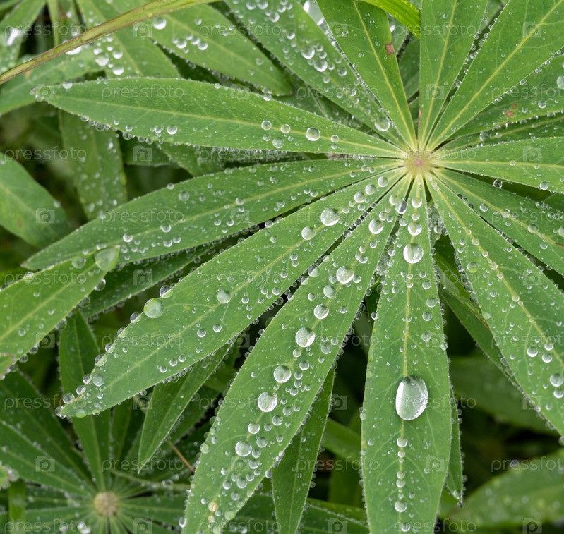 Большой план листьев люпина и капли воды Латинское название: Lupinus wolfish