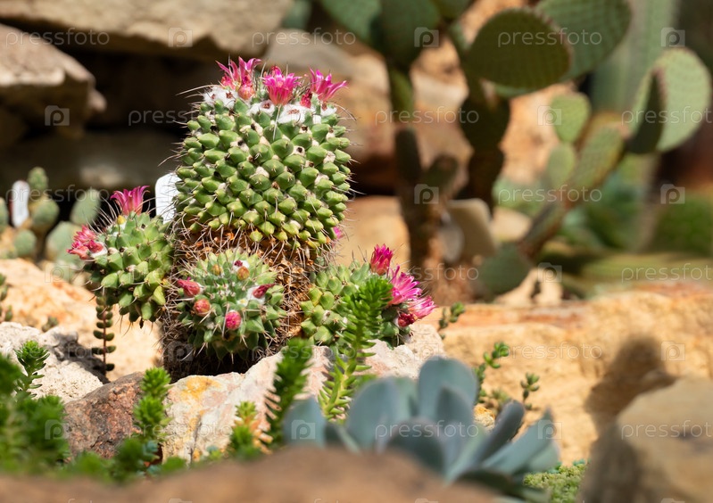 Зеленый кактус с острыми иглами и розовым фиолетовым цветком