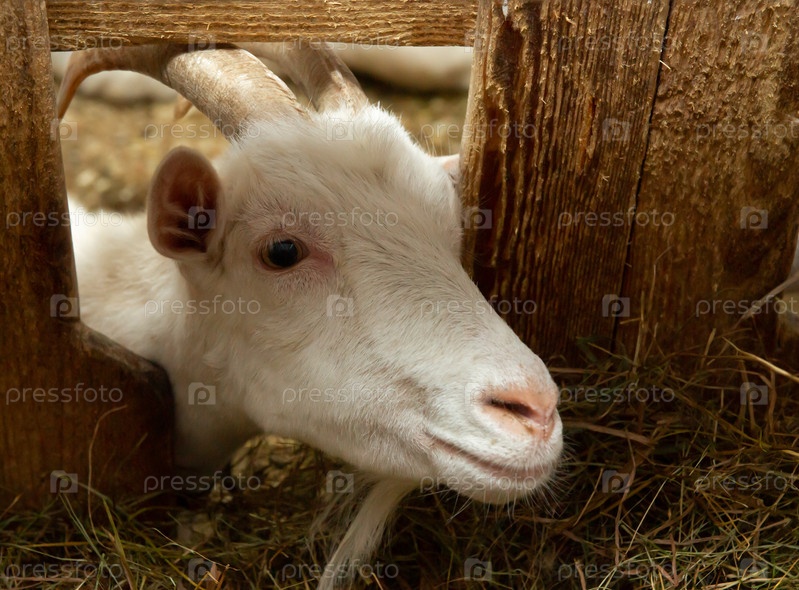 Белая коза в сарае. Домашняя карликовая коза на ферме. Маленькая коза стоит в деревянном укрытии