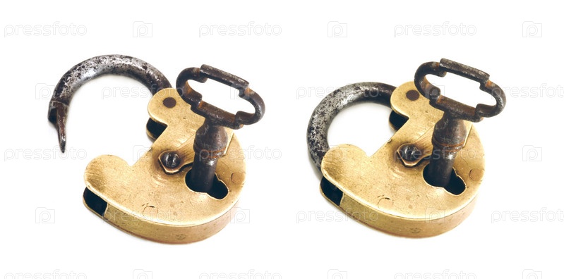 Старинный замок из латуни, открытый и закрытый, с ключом