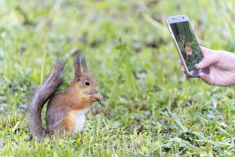 Люди фотографируют рыжую белку, которая ест в парке