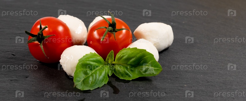 Сыр моцарелла, базилик и томатная вишня на грифельной доске, пространство для копирования