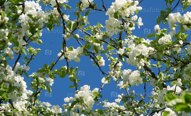 Фон из ветвей яблони с белыми цветами на фоне голубого неба