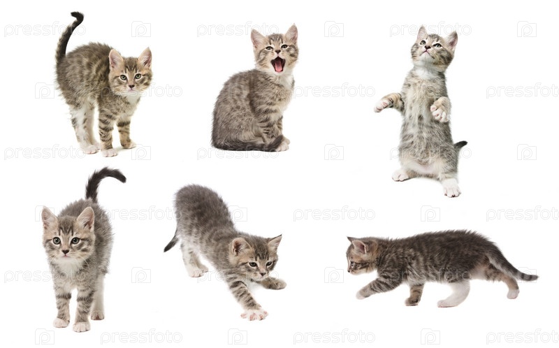 Набор фотографий милого маленького игривого котенка серого цвета, изолированного на белом