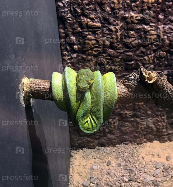 Зеленая змея. На фото зеленая змея, свернувшись калачиком на ветке в зоопарке