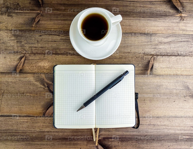 Кофе в чашке и блокнот с ручкой, вид сверху