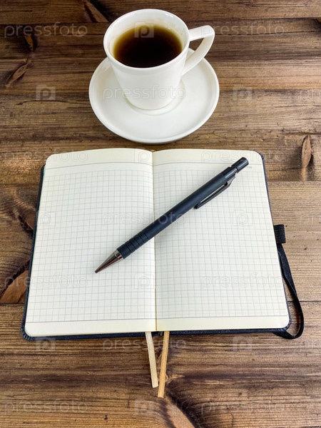 Кофе в чашке и блокнот с ручкой. Вертикальное фото