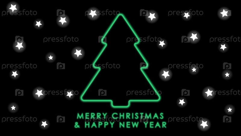 С Новым годом, открытка. Неоновая зеленая рождественская елка и звезды на черном фоне. Праздничная открытка