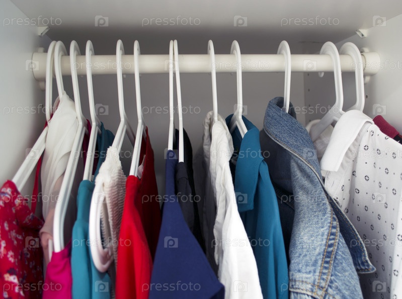 Одежда на вешалках в шкафу
