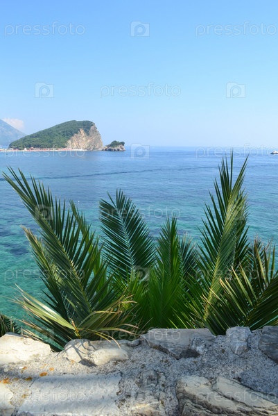 Черногория, Будва. Вид на море. На переднем плане фото пальмы