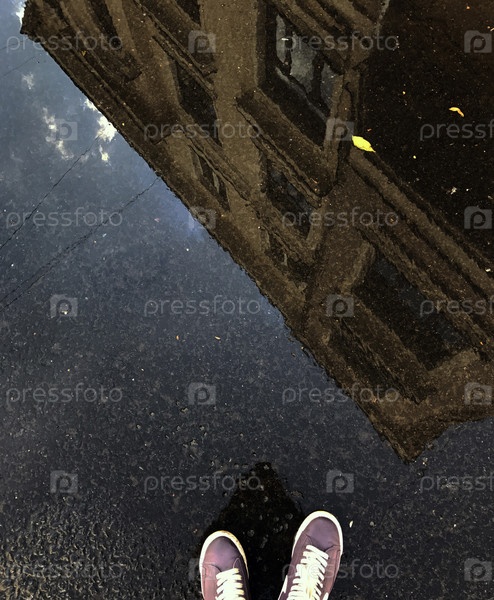 Отражение в луже здания и ноги мужчины в кроссовках
