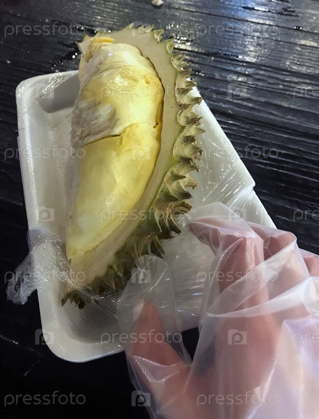 Дуриан. На фото дуриан и рука в перчатке