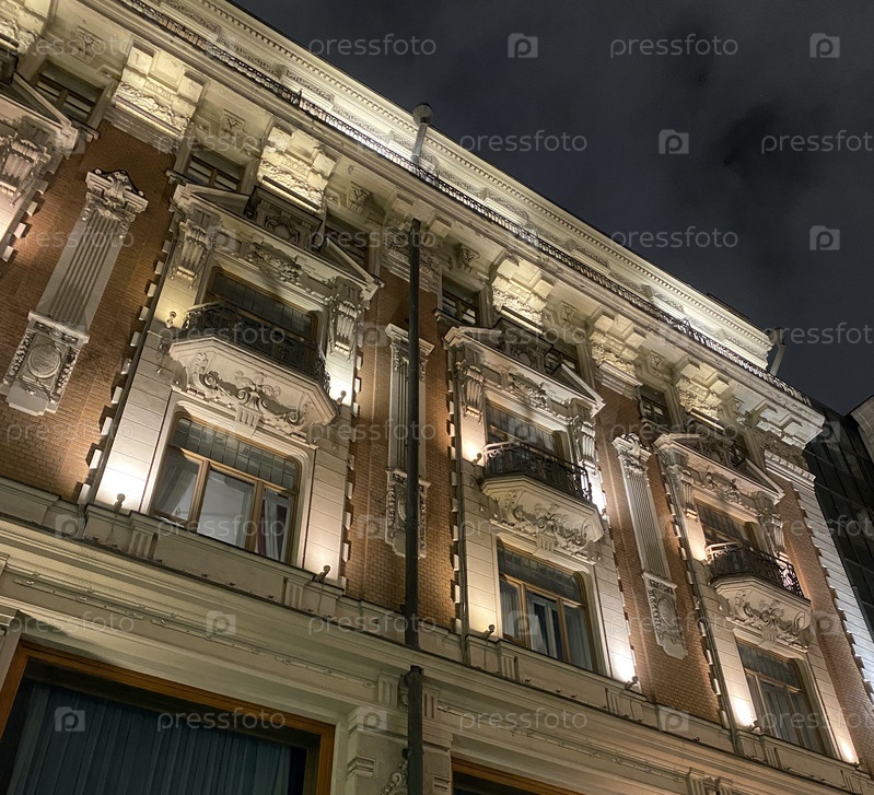 Ночной город, Москва. На фото историческое здание, освещенное фонарями, ночное небо
