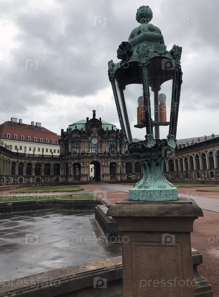 Дрезден, Германия. На фото дворец в Дрездене, на переднем плане фонарь
