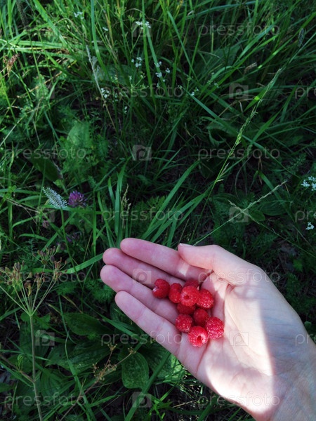 Лесная малина. На фото рука, которая держит лесную малину. трава на заднем плане