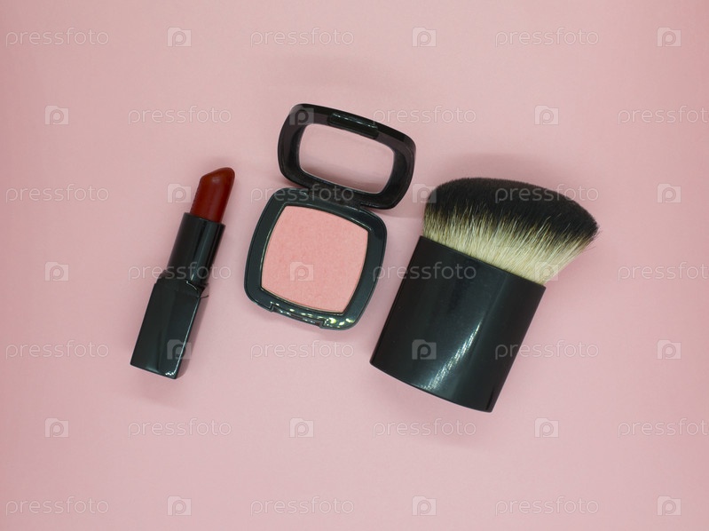 Косметическая кисть, розовый румянец и красная помада
