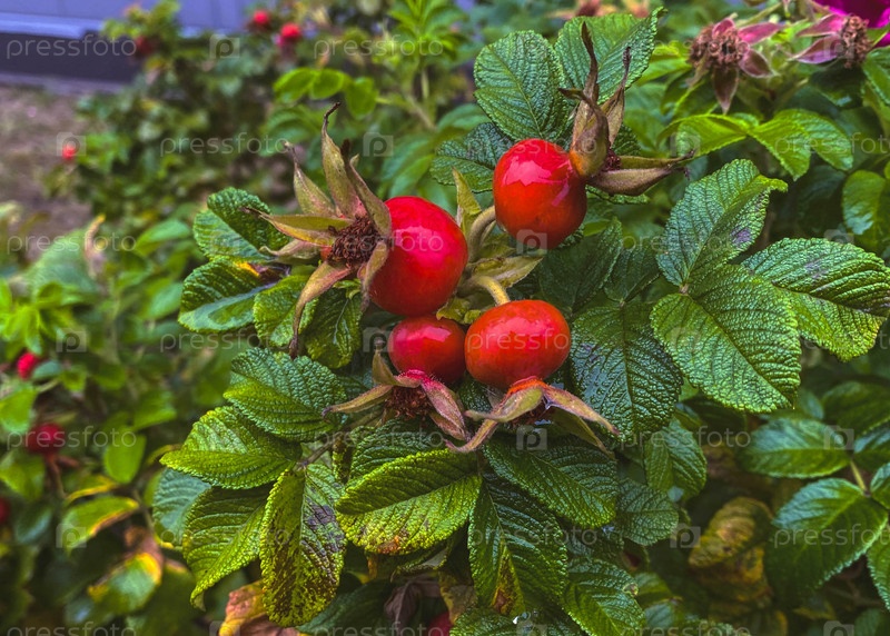 Оранжевые плоды шиповника и зеленые листья, крупным планом