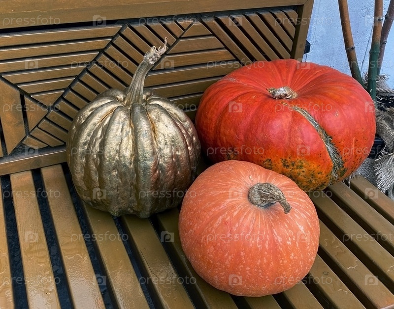 Тыквы на деревянной скамейке