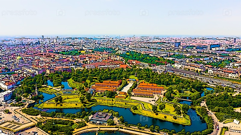 Копенгаген, Дания. Старинный форт Кастеллет. Яркая иллюстрация в мультяшном стиле. С высоты птичьего полета