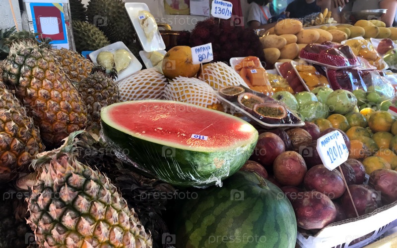 Таиланд, Пхукет, продовольственный рынок. Вид на прилавок с экзотическими фруктами