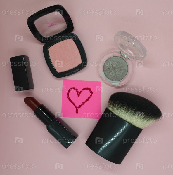 Косметическая кисть, румяна, красная помада, тени для век